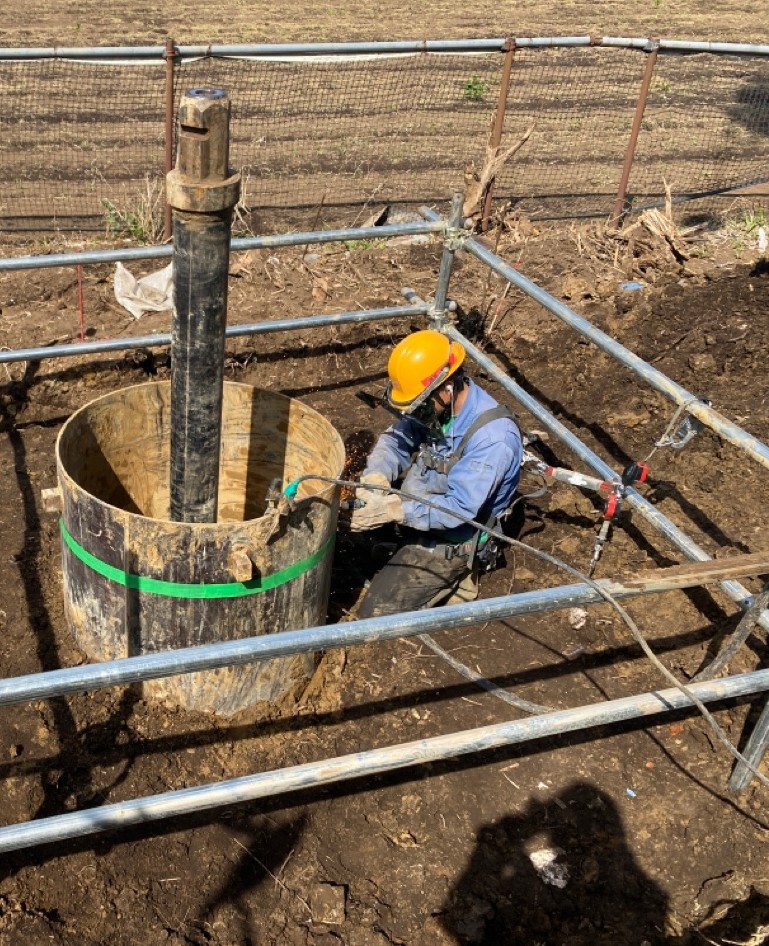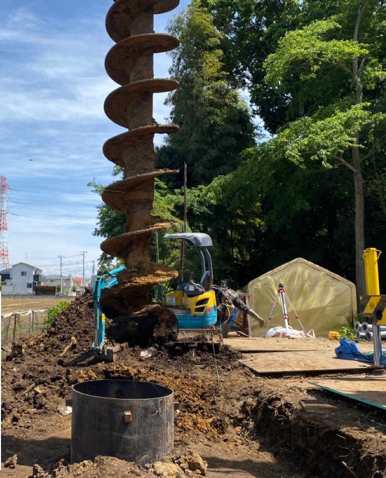 携帯電話基地局基礎工事で、φ914.4の鋼管を10.5m圧入・掘削しています。